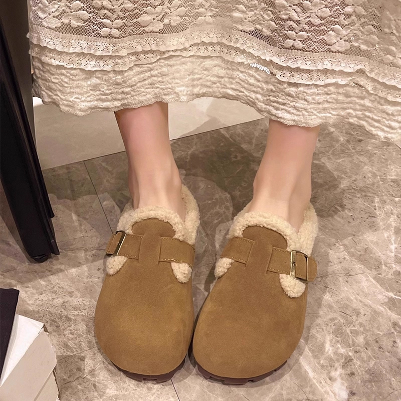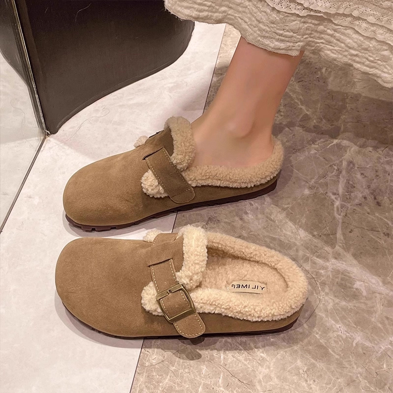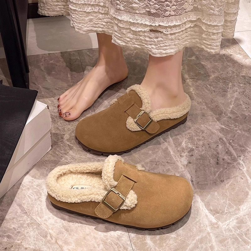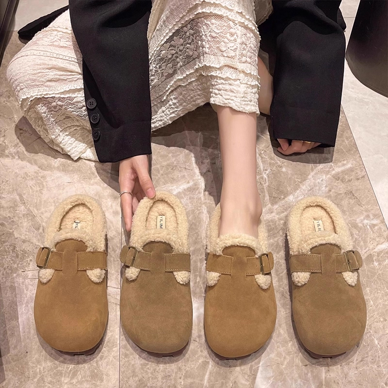 秋冬季 女外穿2025新款 一脚蹬懒人平底包头棉拖 加绒毛毛拖鞋 勃肯鞋