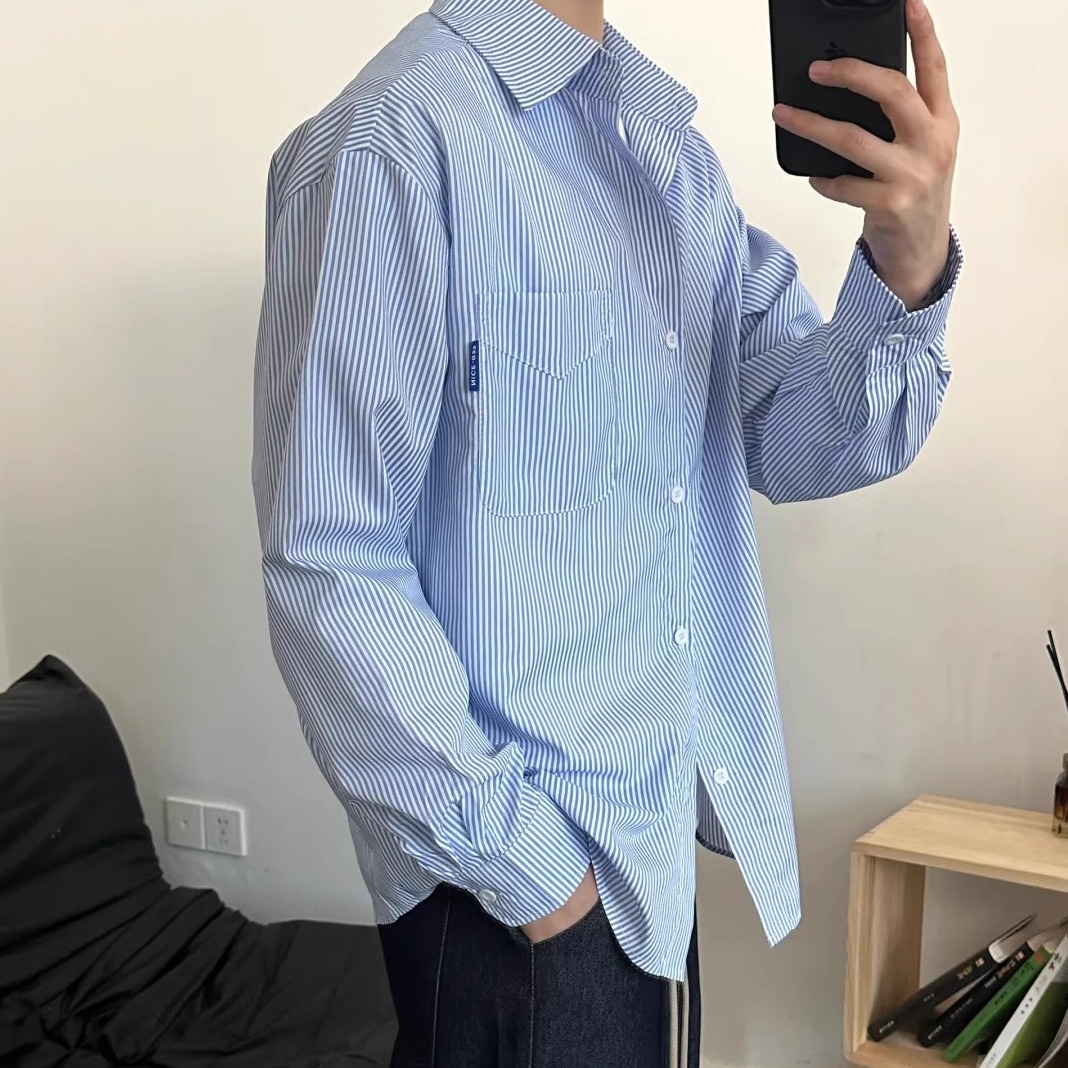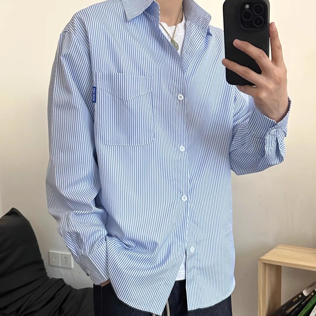 少年感休闲上衣美式 中性翻领条纹情侣长袖 衬衣 男女衬衫 春秋新款