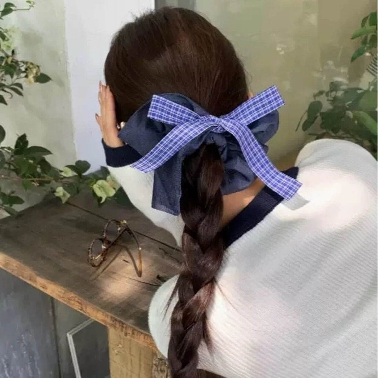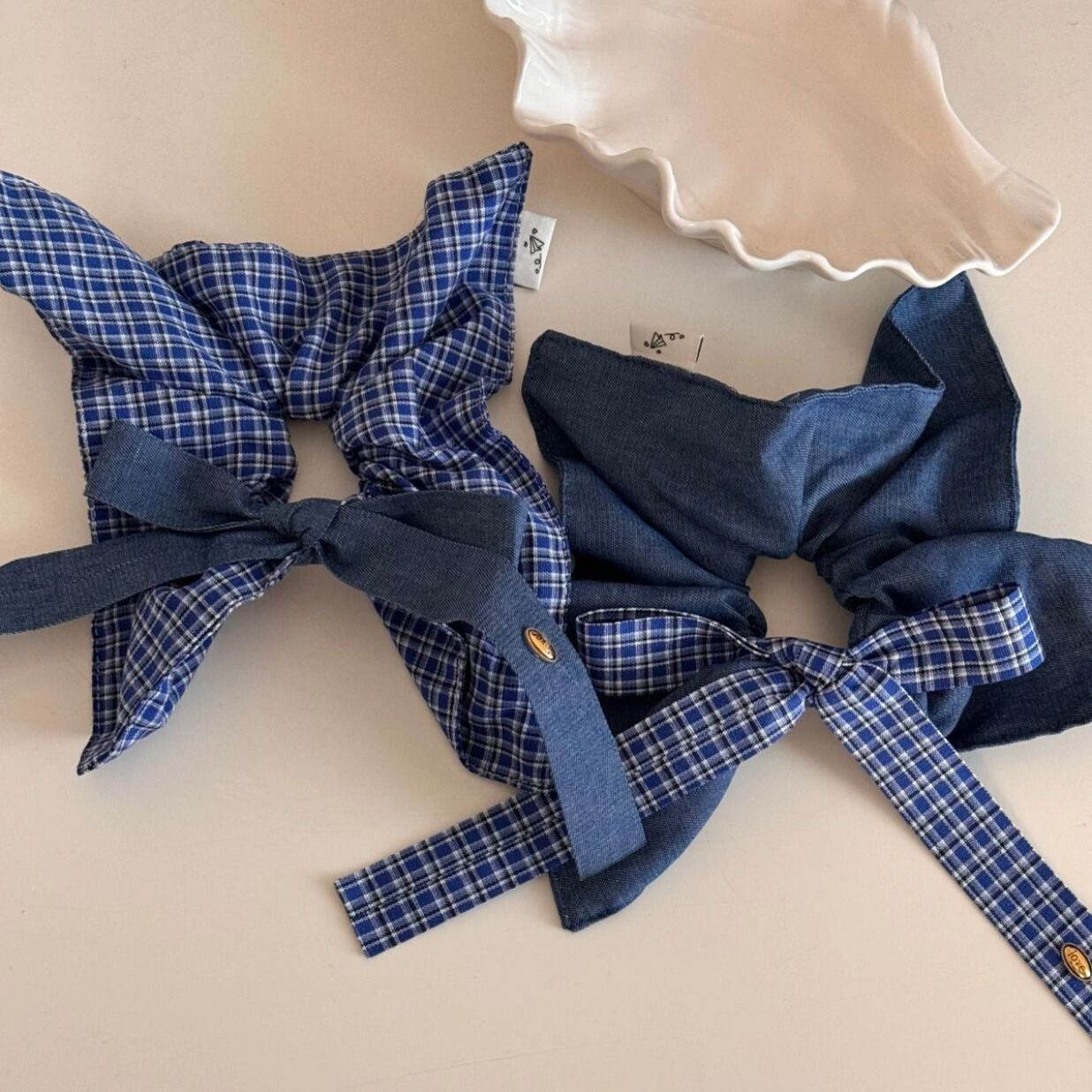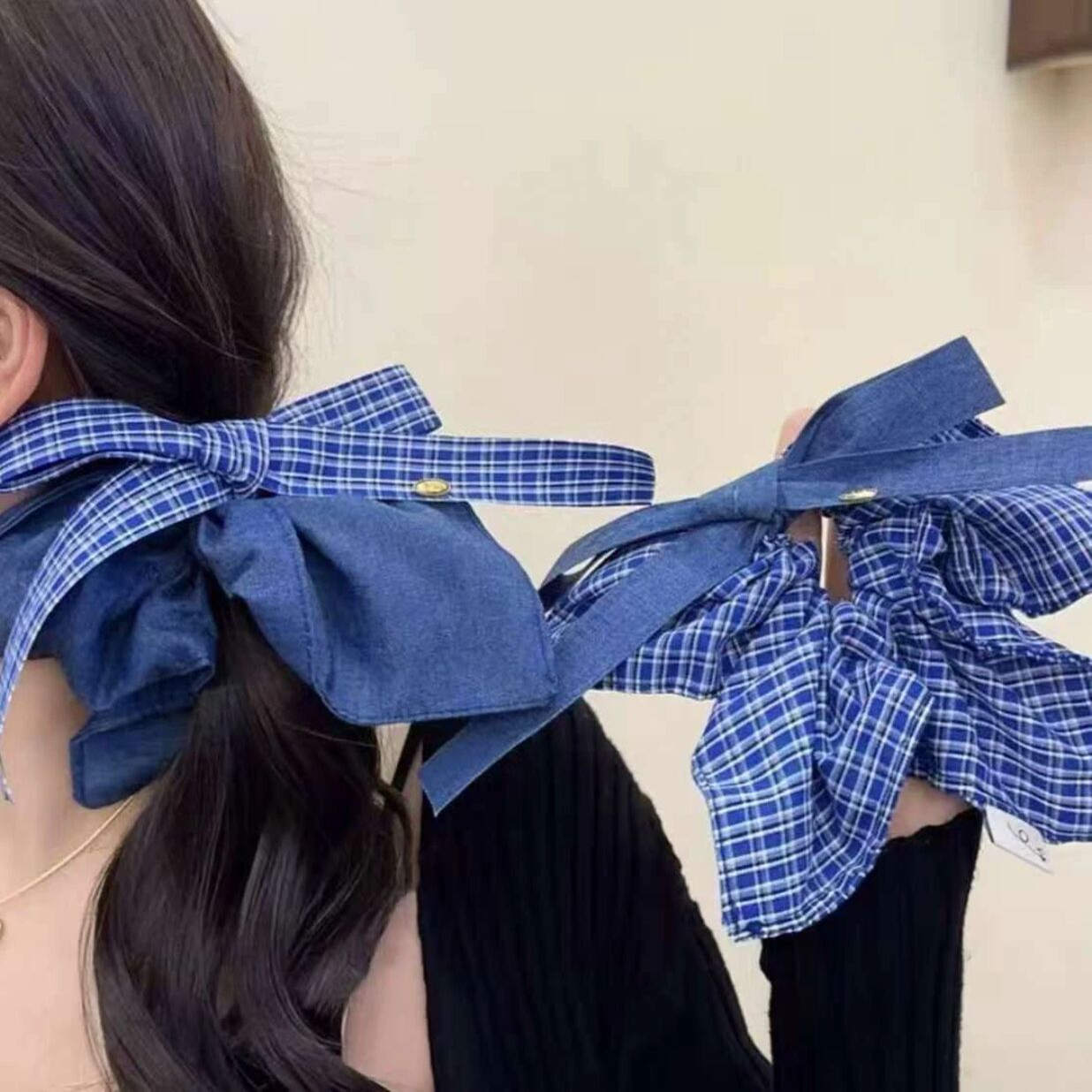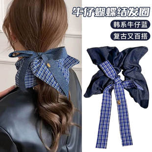 韩系高级感复古牛仔蓝蝴蝶结格纹方巾发圈ins气质低马尾头绳发饰