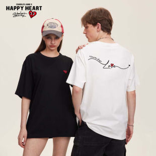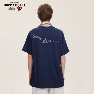 新款 t恤男手绘线稿字母印花纯棉圆领夏季 落肩体恤 短袖 查尔斯桃心