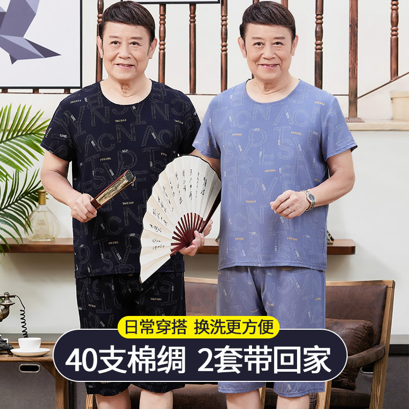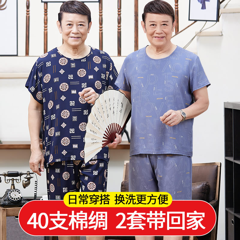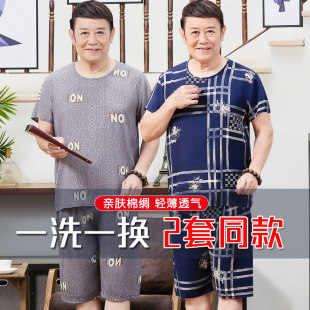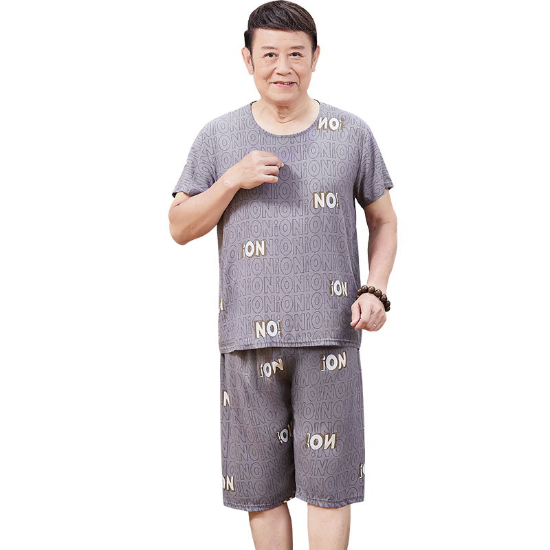 宽松薄款 爸爸睡衣男款 大码 中老年人冰丝棉绸短袖 人造棉家居服 夏季