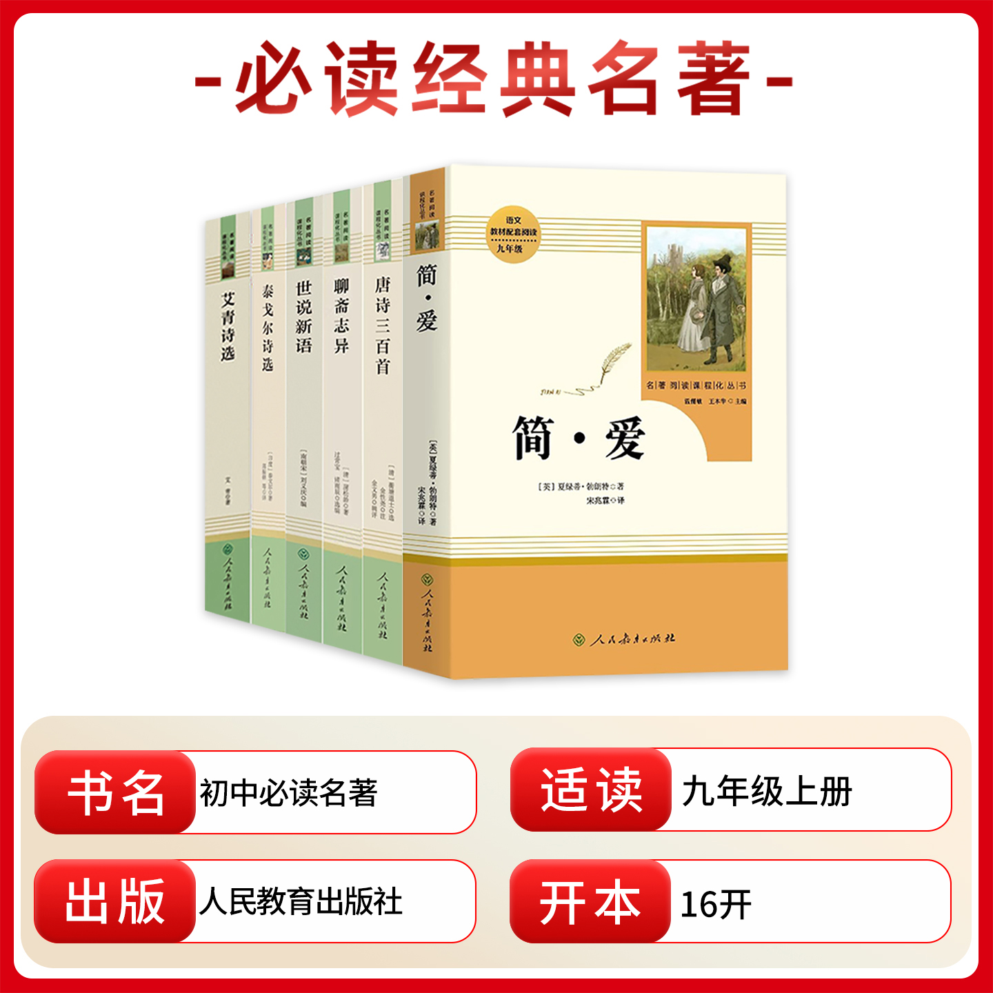 人民教育出版 简爱唐诗三百首艾青诗选世说新语聊斋志异泰戈尔诗选初三名著阅读无删减老师推荐 社 课外必读全套7册 九年级上册人教版