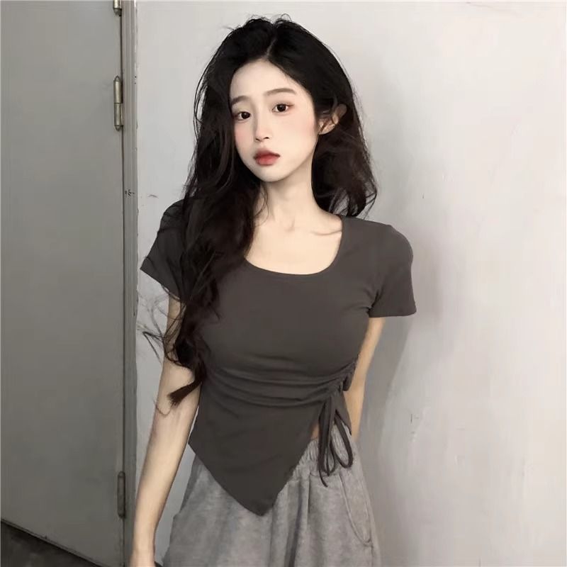 T恤女夏季 辣妹短款 修身 内搭打底衫 上衣潮 韩版 不规则抽绳下摆短袖