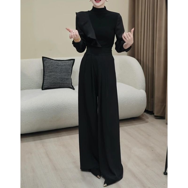 上衣高腰阔腿裤 2025春季 简约显瘦半高领长袖 韩版 休闲两件套潮 新款
