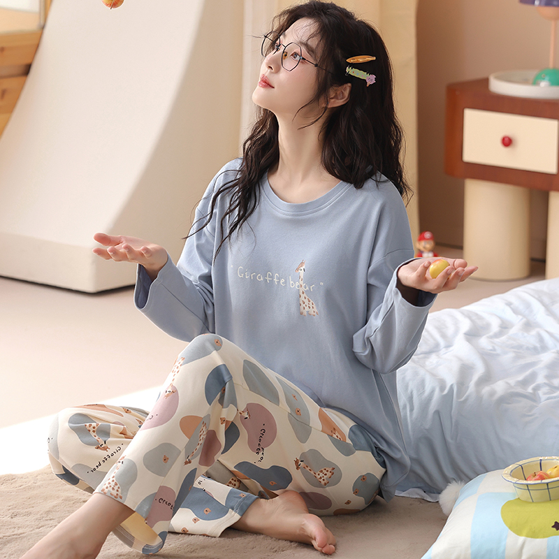 家居服 纯棉蓝色小清新长颈鹿卡通印花睡裤 卡之恋睡衣女款 春秋长袖