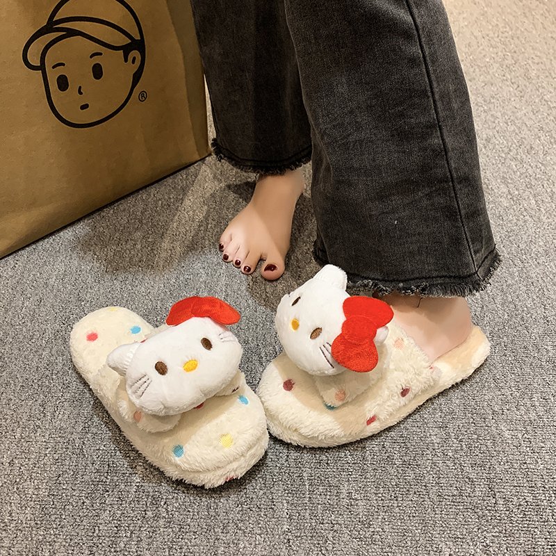 可爱波点凯蒂猫棉拖鞋 女秋冬室内静音地板拖轻便Kitty猫毛毛拖鞋
