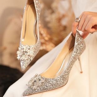 秀禾婚纱两穿浅口单鞋 达芙妮高跟鞋 新娘鞋 气质水钻婚鞋 女2025新款