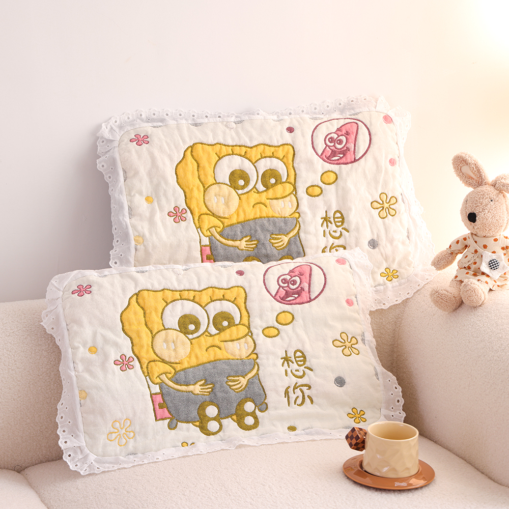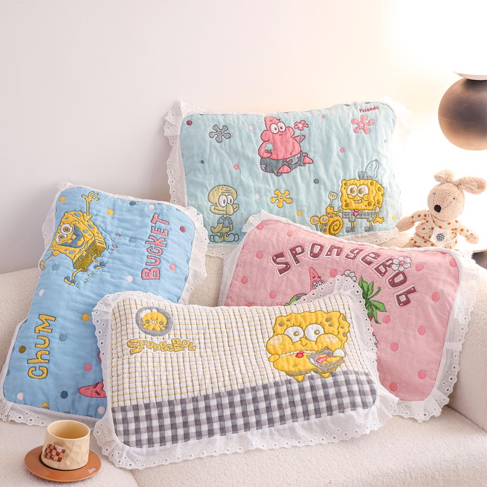 海绵宝宝花边纯棉纱布儿童枕巾一对装 卡通柔软盖巾全棉枕头巾 四季