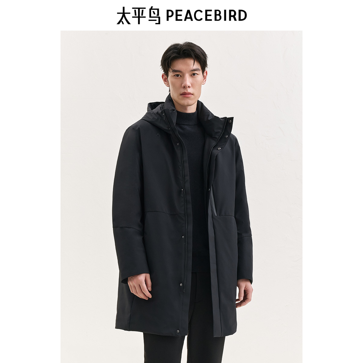 商务羽绒服男冬季 太平鸟男装 通勤连帽黑色保暖防寒服 中长款