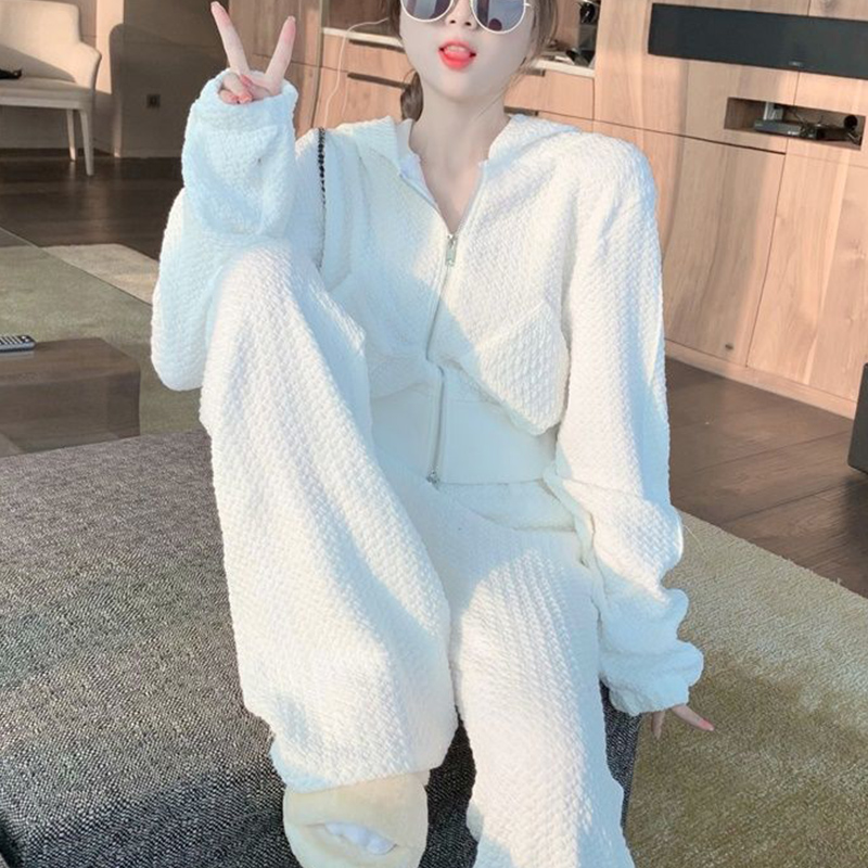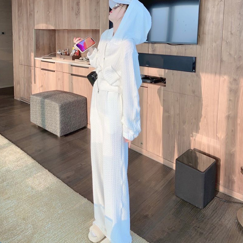 跑步运动服白色套装 秋季 卫衣两件套休闲时尚 连帽拉链薄款 女潮 新款