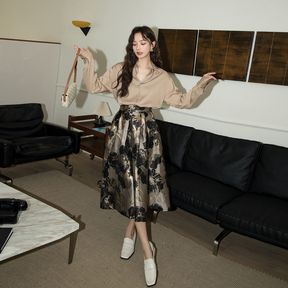 高腰复古显瘦半身裙女设计感小众重工提花黑色伞裙赫本风a字裙子