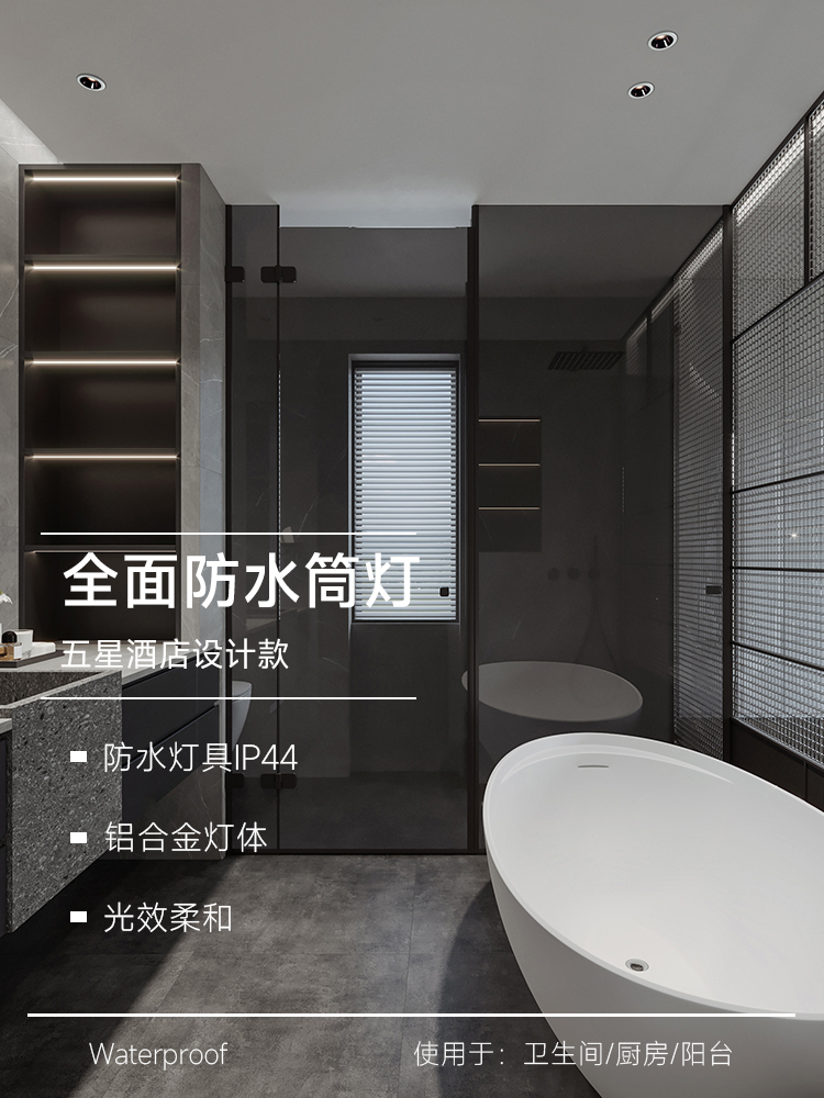 梦泽防水筒灯暗装 卫生间浴室厨房淋浴间湿区铝扣板透镜黑杯防眩雾