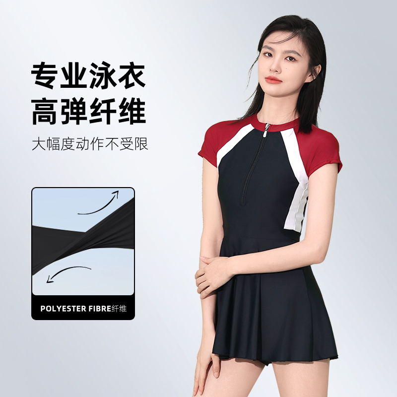 连体泳衣女士海边度假保守女孩显瘦遮肚泳装 平角游泳衣 防走光裙式