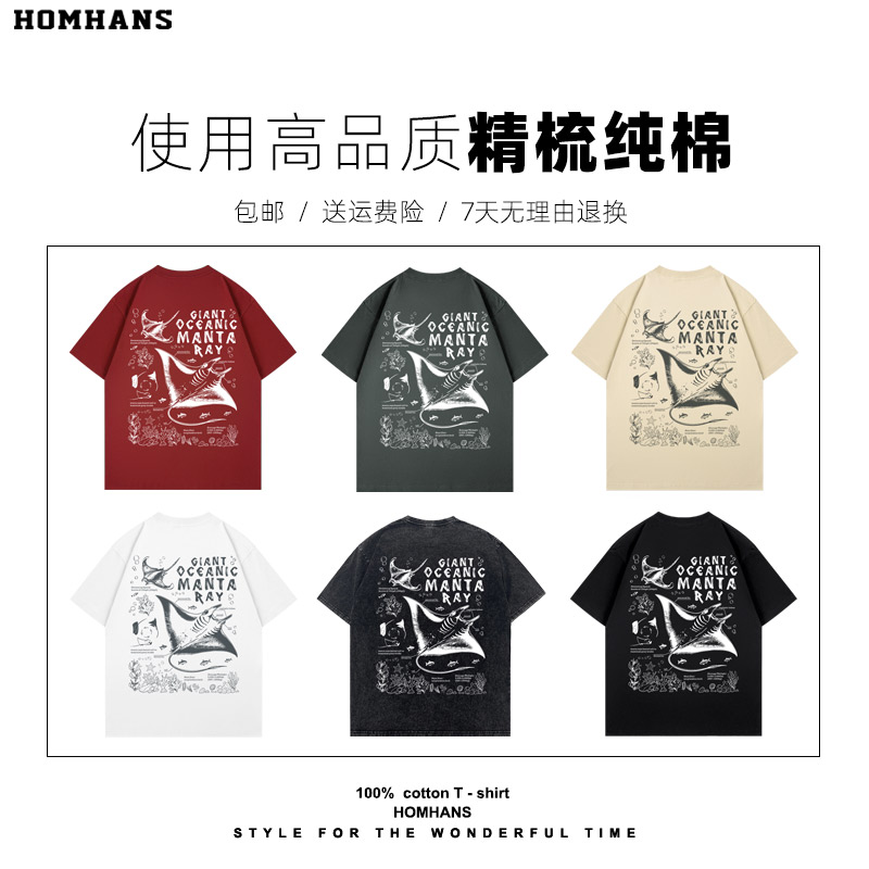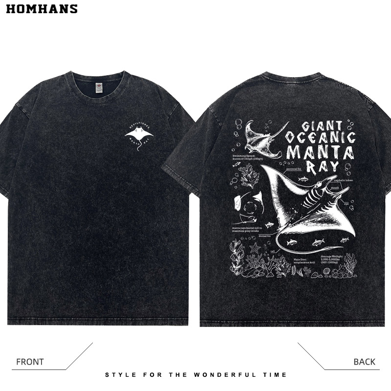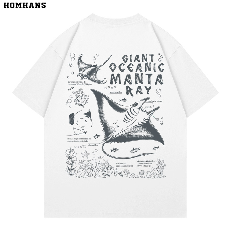 宽松休闲纯棉新款 蝠鲼魔鬼鱼海洋馆科普生物印花短袖 T恤男女同款