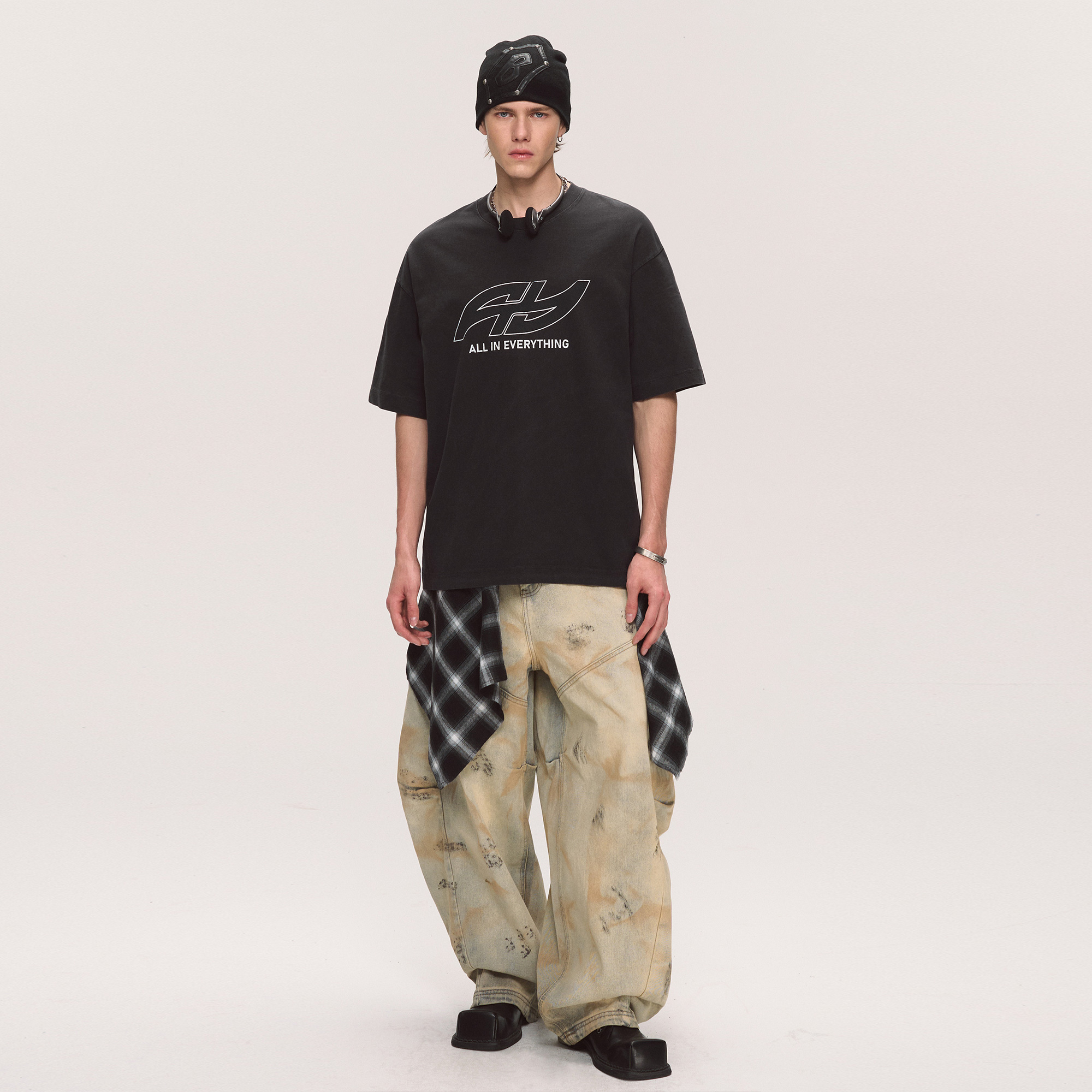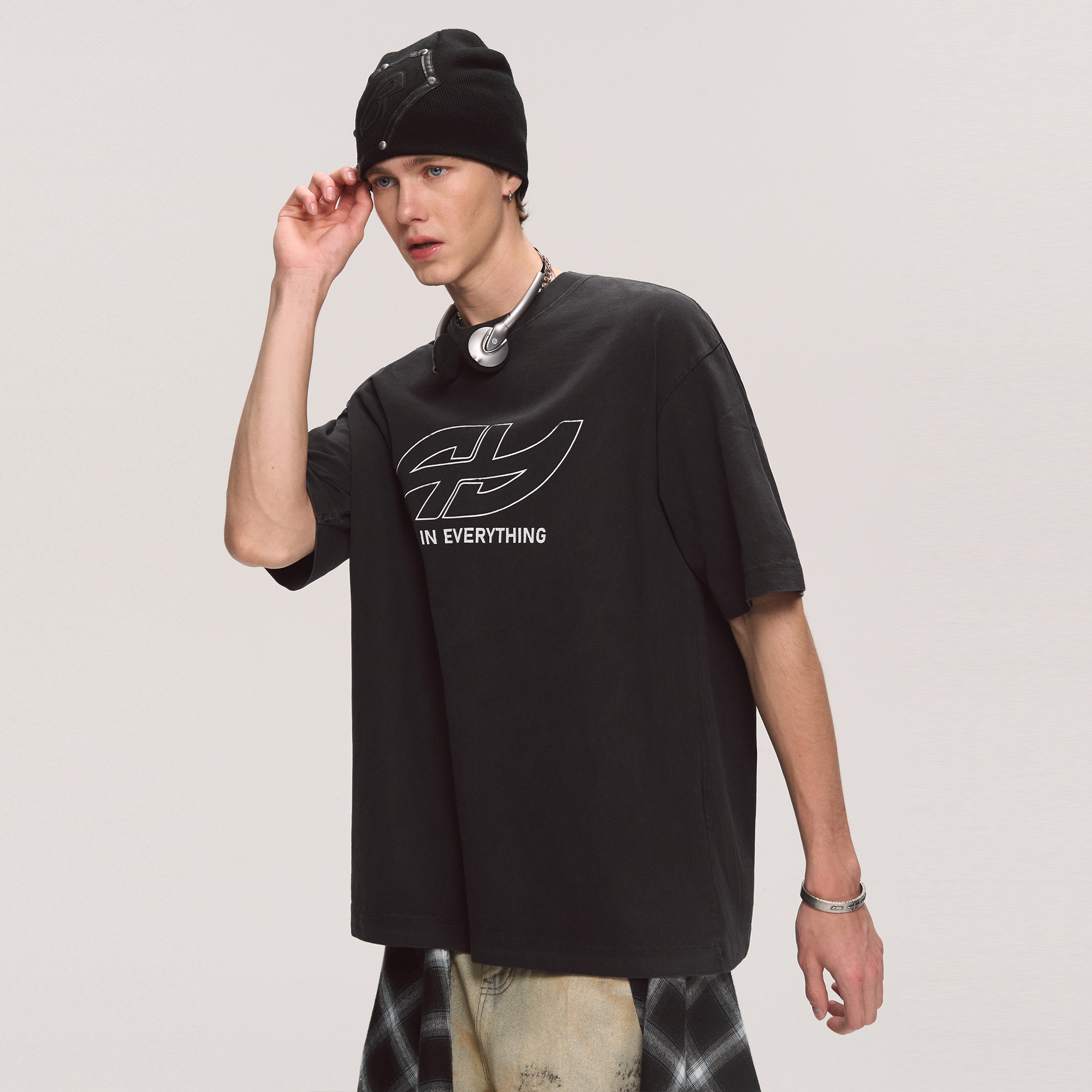 潮牌情侣半袖 ALLIN 纯棉重磅体恤衫 t恤男生夏季 上衣 水洗黑色短袖