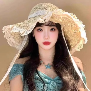 法式 蕾丝花边海边度假沙滩飘带防晒大帽檐太阳帽子 遮阳草帽女夏季