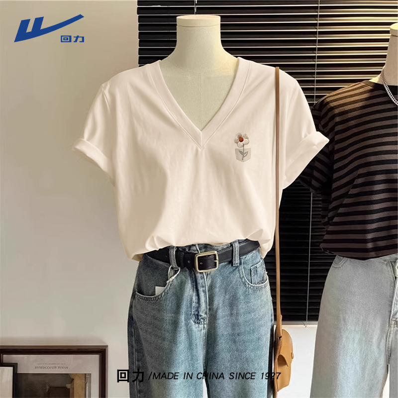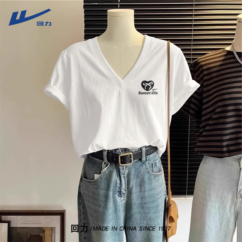 女装 回力v领t恤女夏2025新款 新中式 夏季 显瘦宽松上衣女A 黑色短袖
