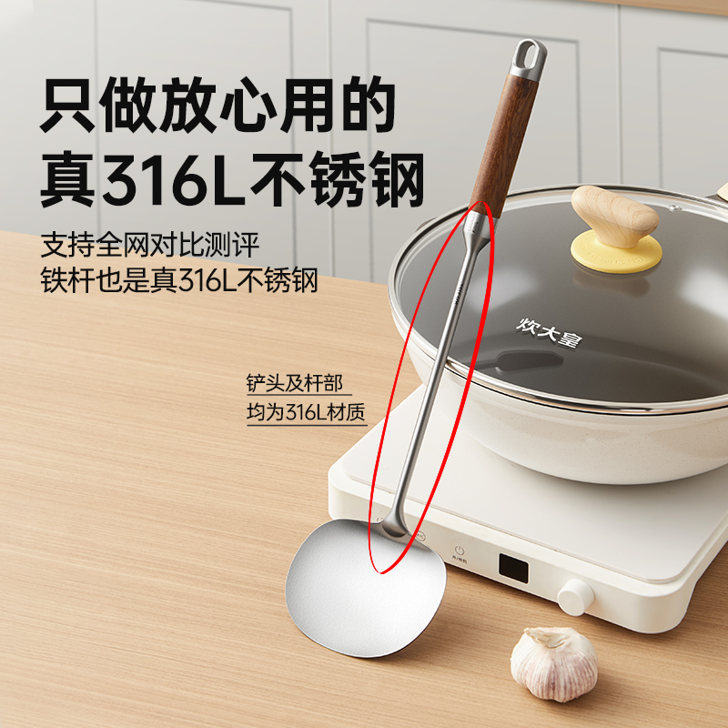 炊大皇316L不锈钢蘑菇铲锅铲炒菜铲子厨具家用厨房防烫花梨木炒勺