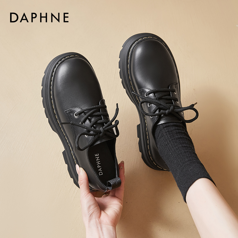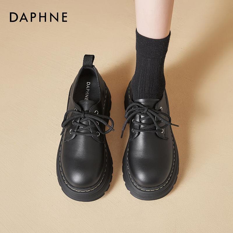 系带加绒牛津单鞋 达芙妮黑色小皮鞋 学院厚底乐福鞋 新款 女2025秋季
