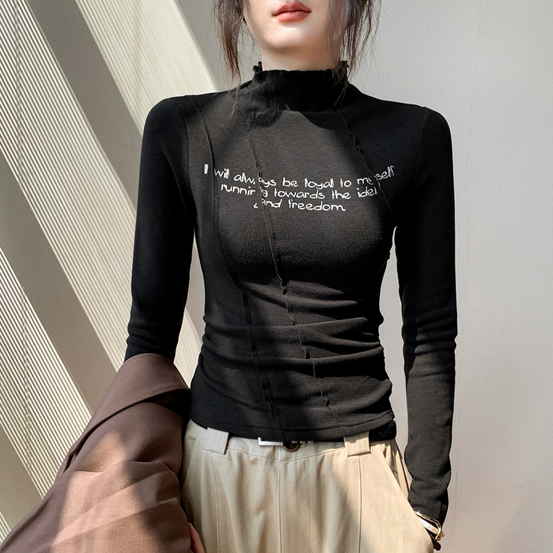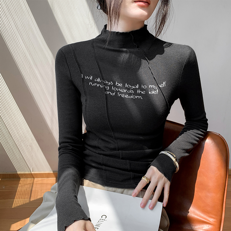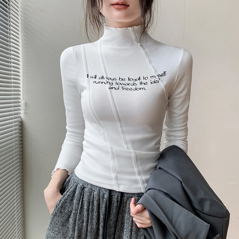 拼接内磨毛小众字母印花打底衫 新款 T恤女2025秋季 花边半高领长袖