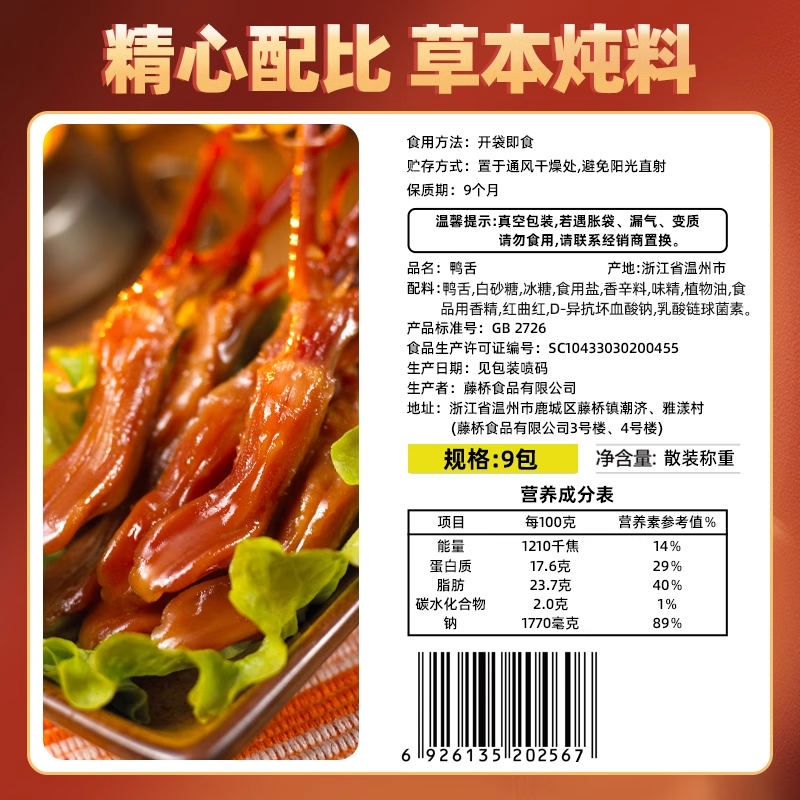 藤桥古镇温州特产正宗酱鸭舌香辣卤味宿舍小零食9小包 福利购