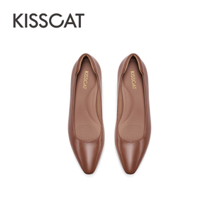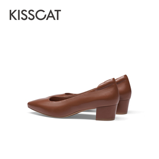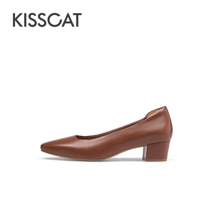 女 气质通勤浅口单鞋 KISSCAT接吻猫尖头真皮粗跟鞋 裸色法式