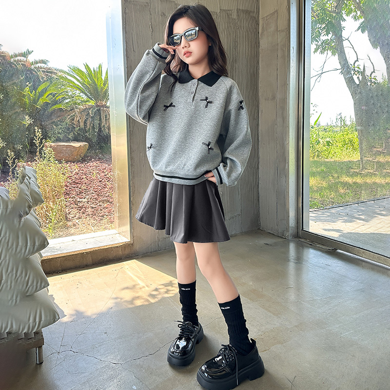 洋气女大童POLO领蝴蝶结卫衣百褶裙套装 女童连衣裙春秋款 2025新款