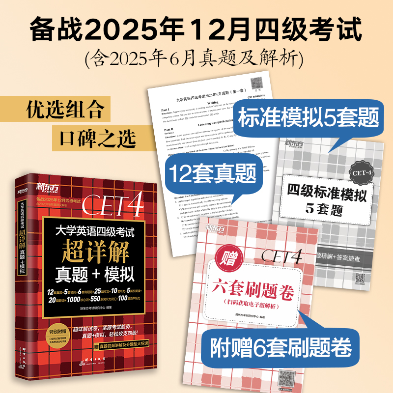 备考2025年12月新东方英语四级真题超详解大学英语四级考试历年真题卷资料cet4单词汇词书卷子阅读听力作文课程 含6月纸质真题