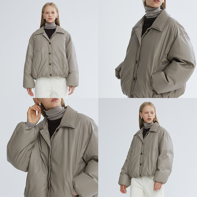 北欧时刻复古PU皮白鸭绒短款 保暖翻领加厚外套面包服 羽绒服女冬季