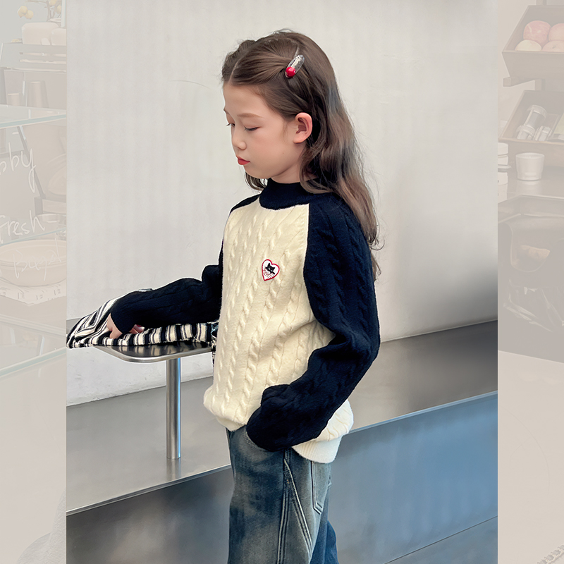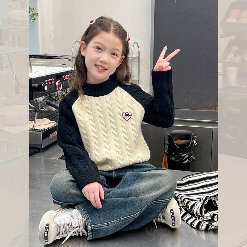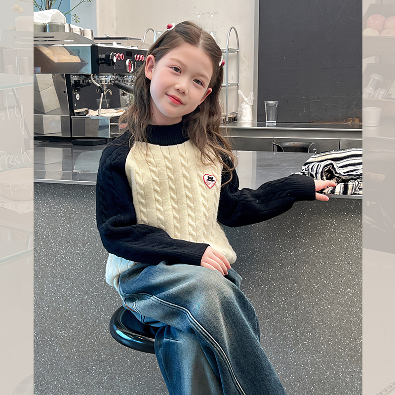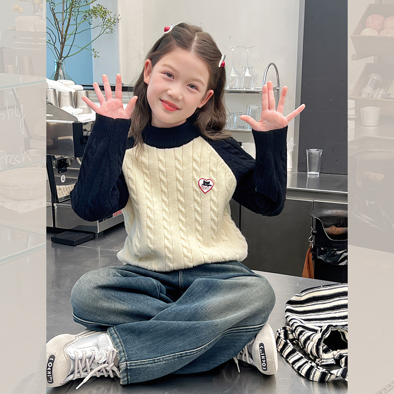 新款 洋气上衣女孩线衣2024冬装 大童装 女童撞色毛衣儿童高领针织衫