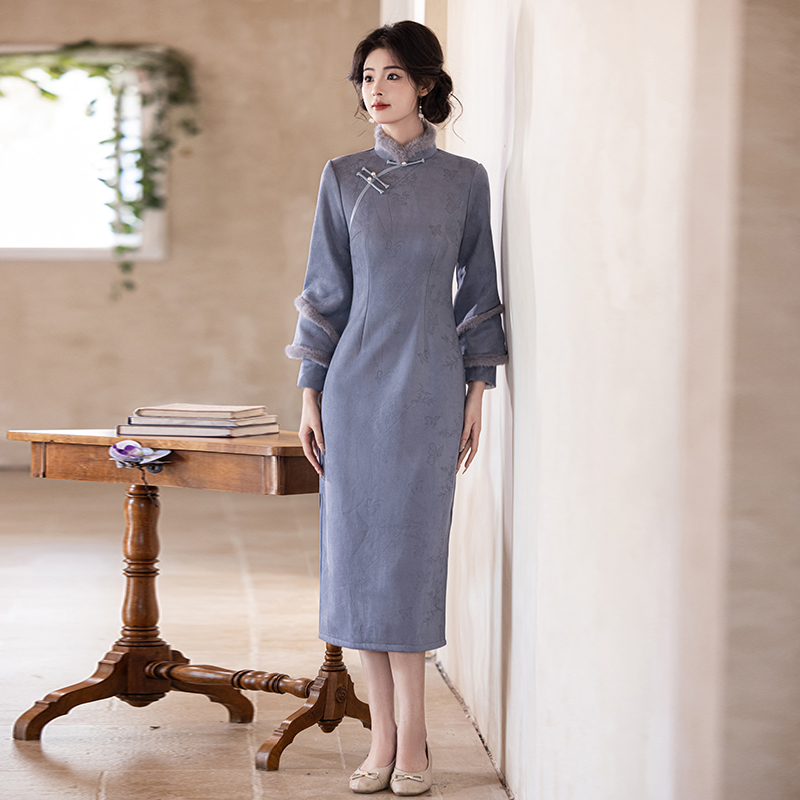 新中式 倒大袖 加绒加厚优雅 保暖毛绒领旗袍2025年冬新款 蓝色年轻款