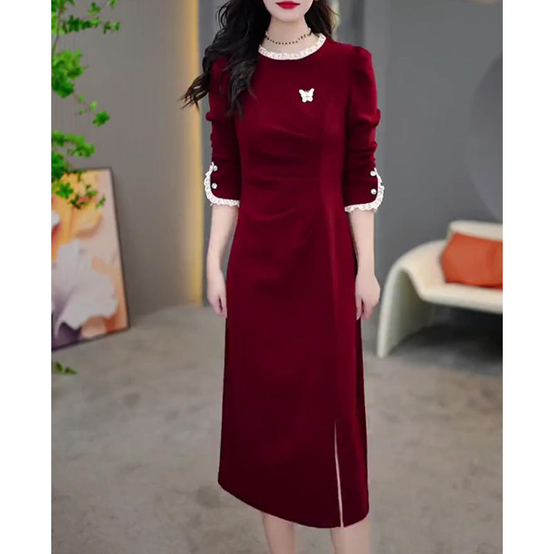 时尚 新款 气质显瘦裙子 开衩A字连衣裙女2025秋季 设计感蕾丝中长款