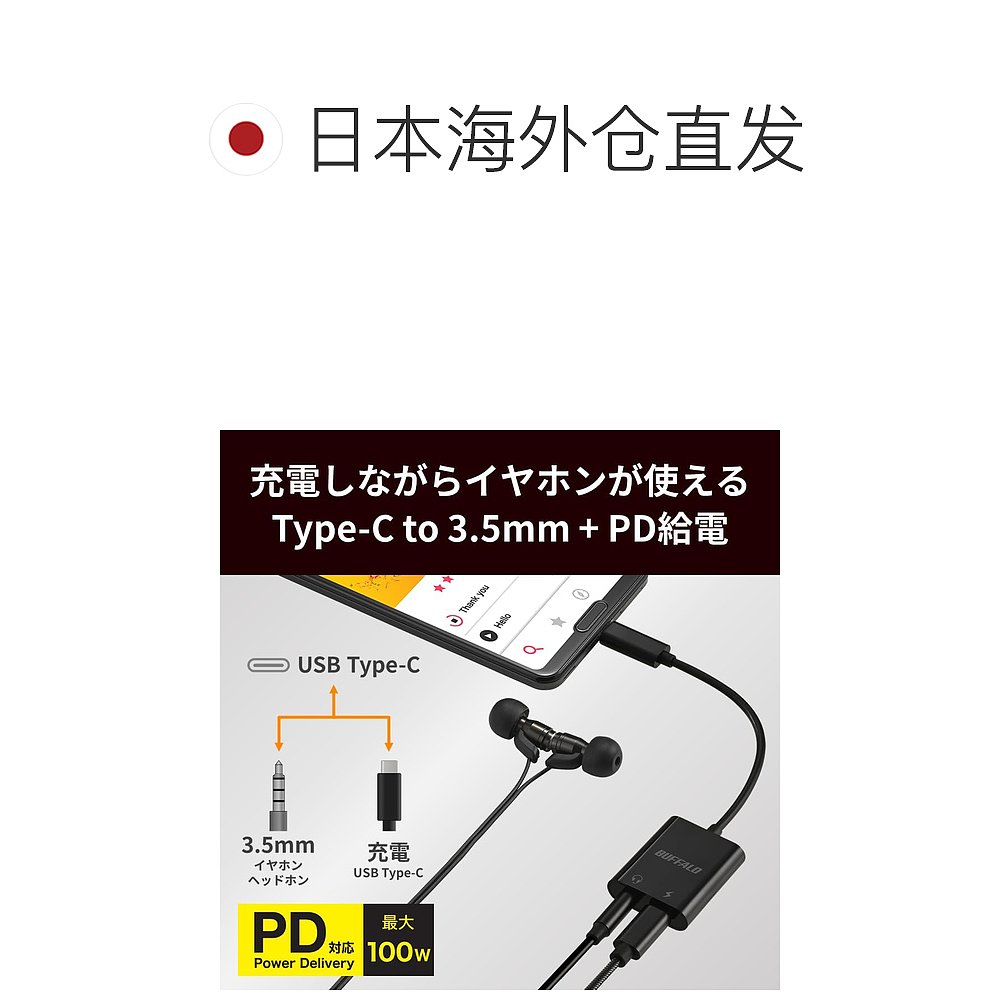 日本直邮 Type Buffalo巴法络 USB C转3.5mm黑 音频转换适配器
