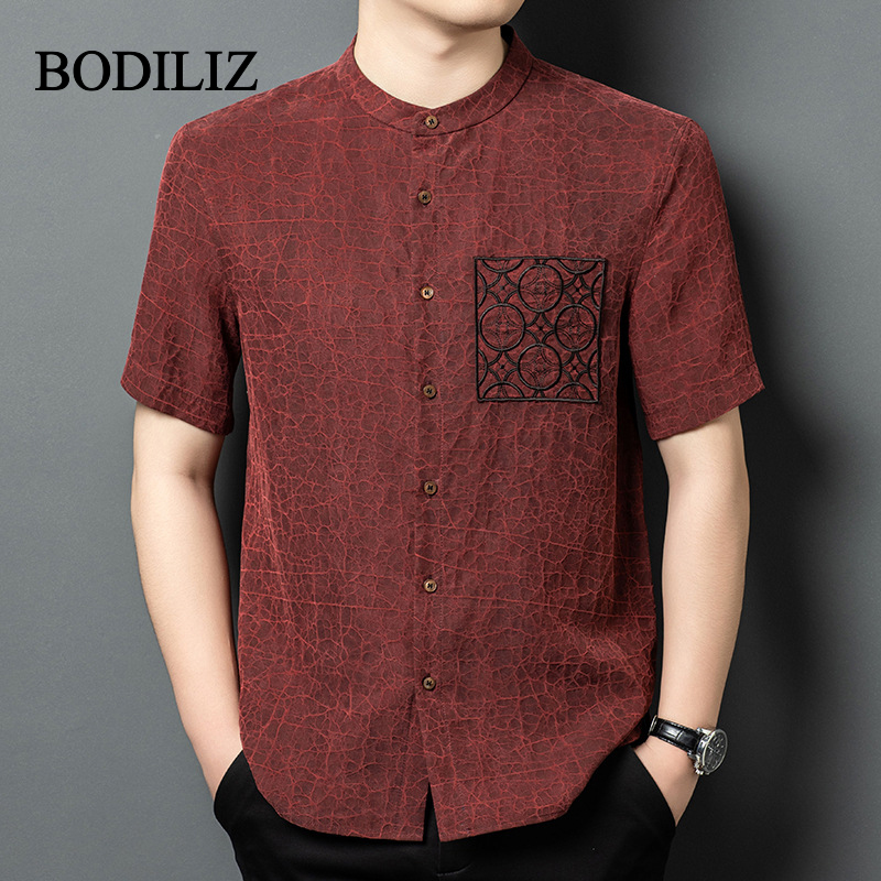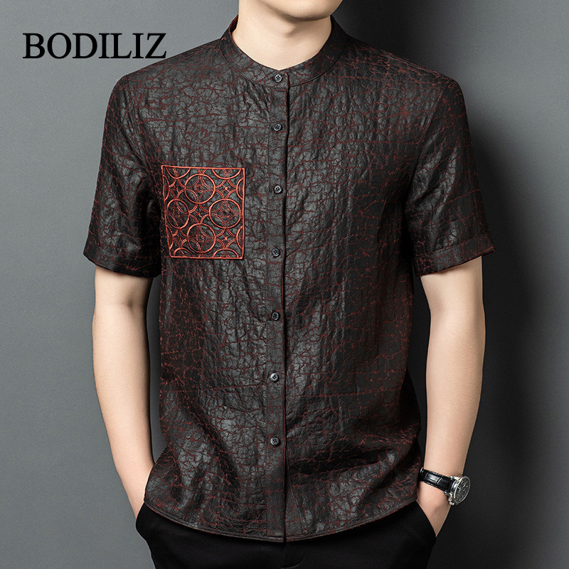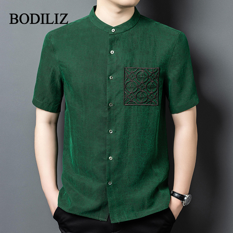 绸缎真丝夏款 男短袖 中老年宽松商务衬衣 香云纱衬衫 奢侈品龟纹中式