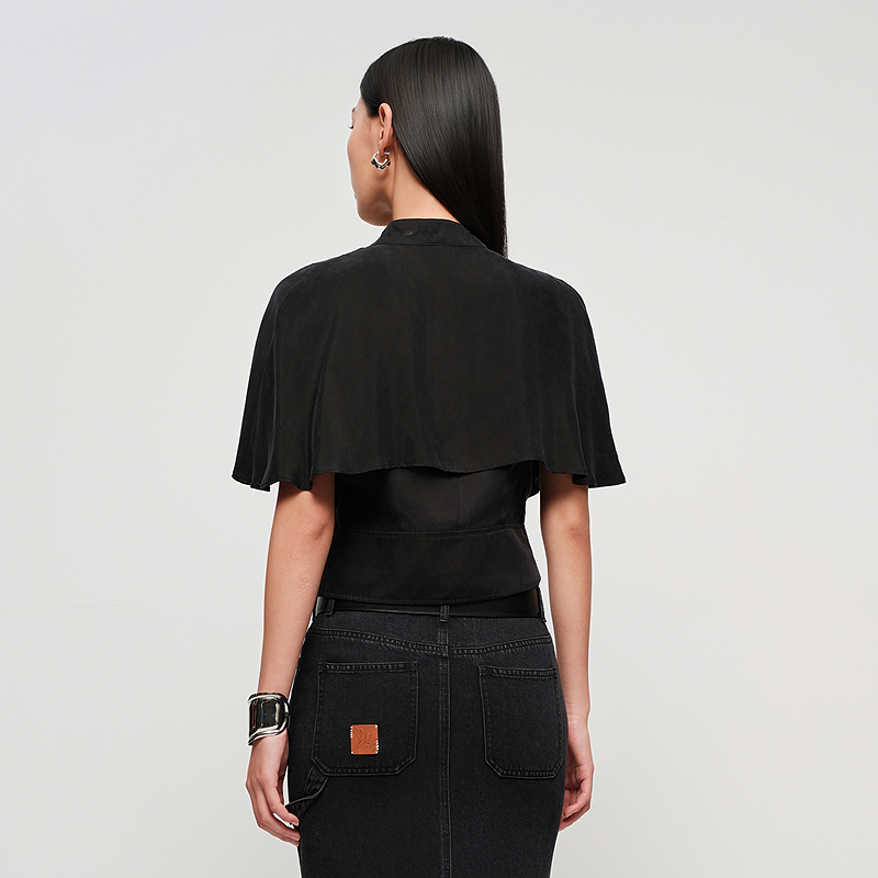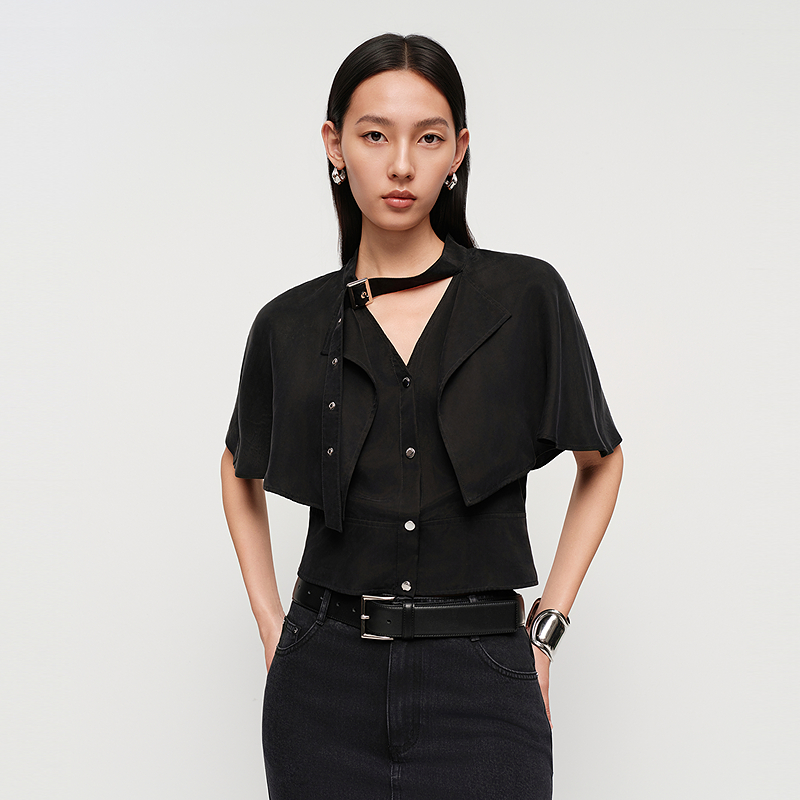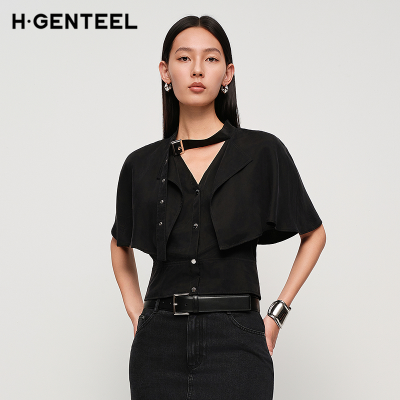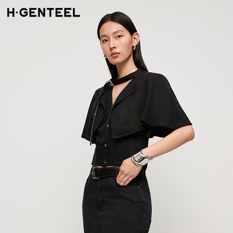 秋装 衬衫 女黑色短款 个性 翻驳领金属扣喇叭袖 H·GENTEEL荷高25新款