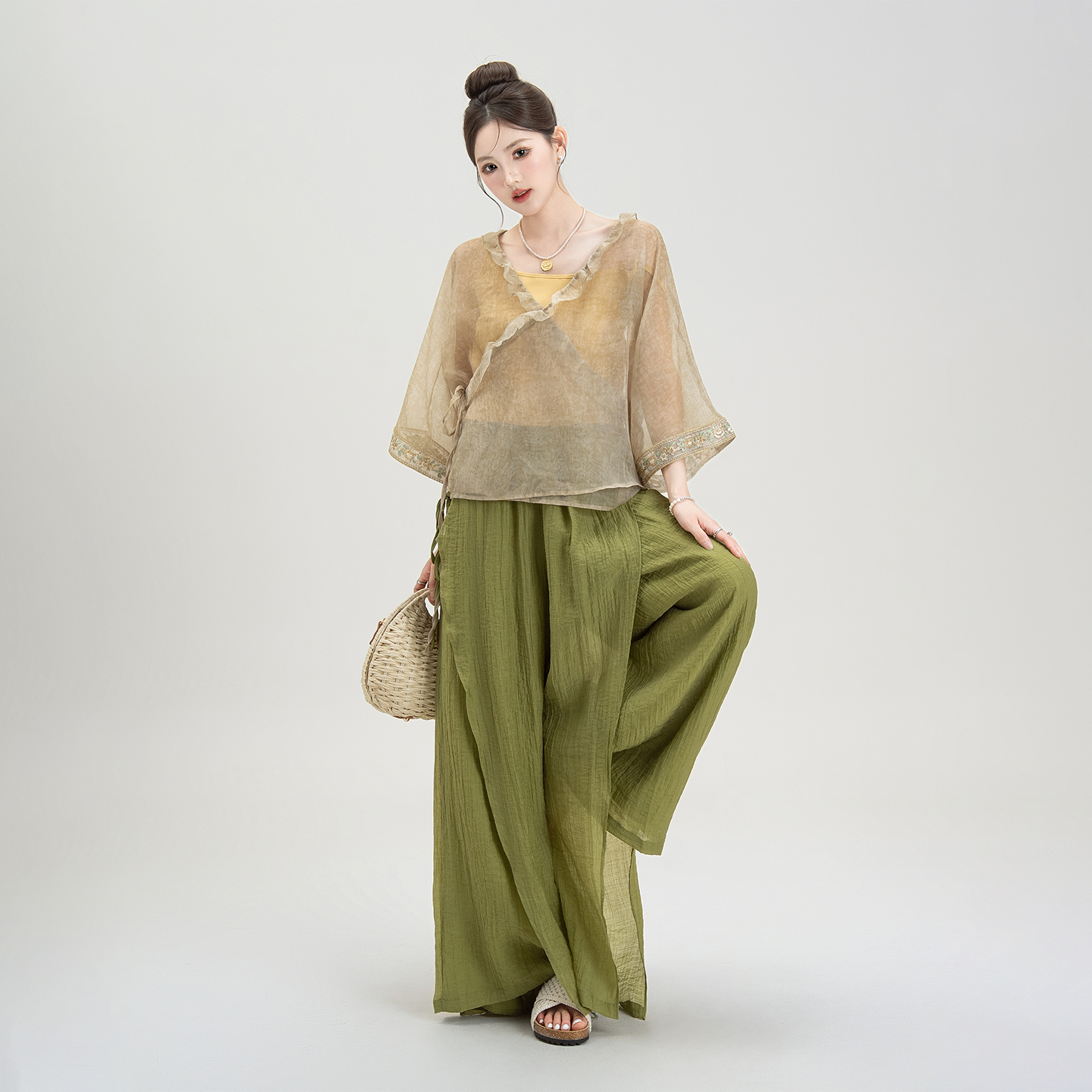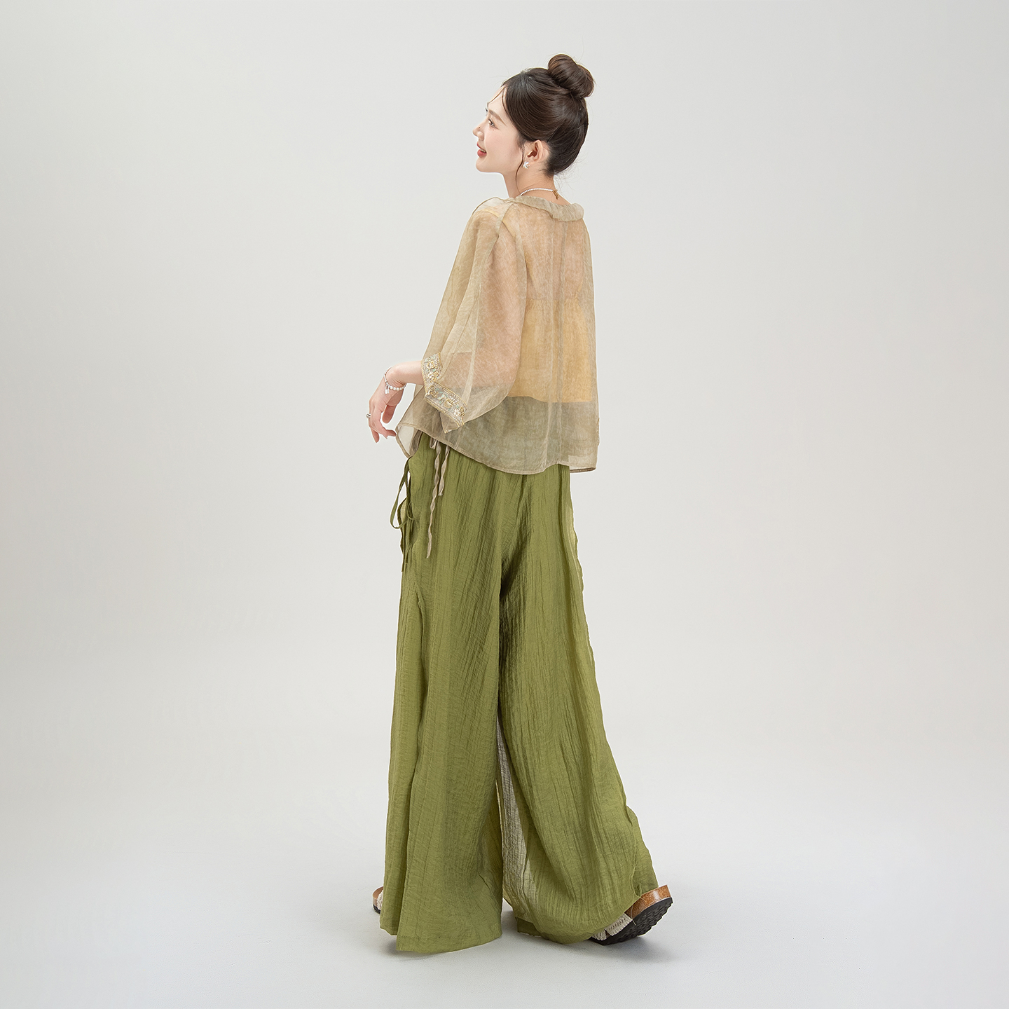 新款 女夏季 吊带背心宽松长袖 衬衫 子三件套 新中式 阔腿长裤 国风套装