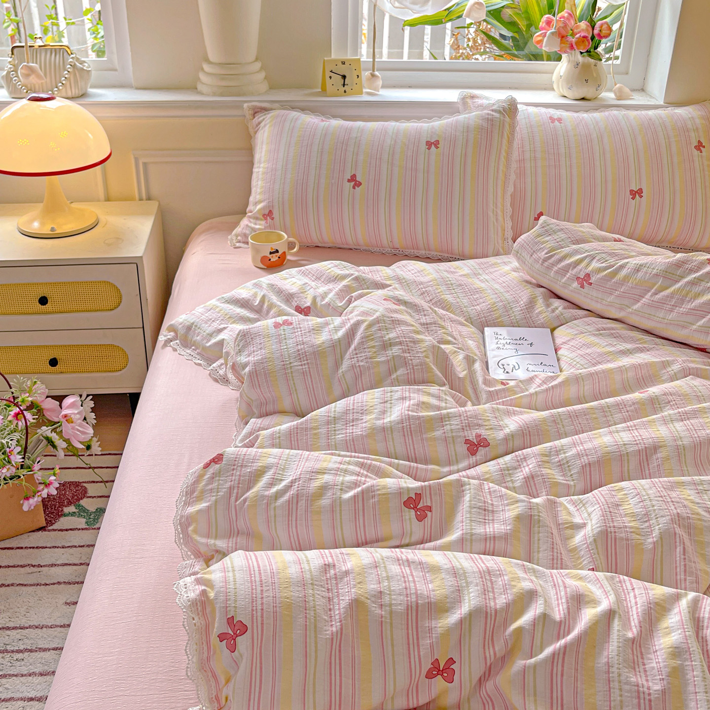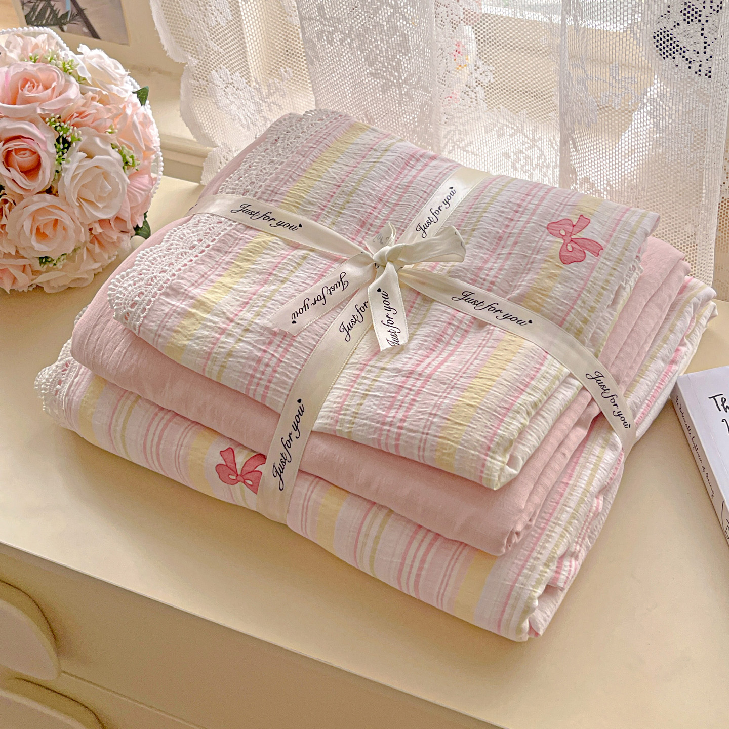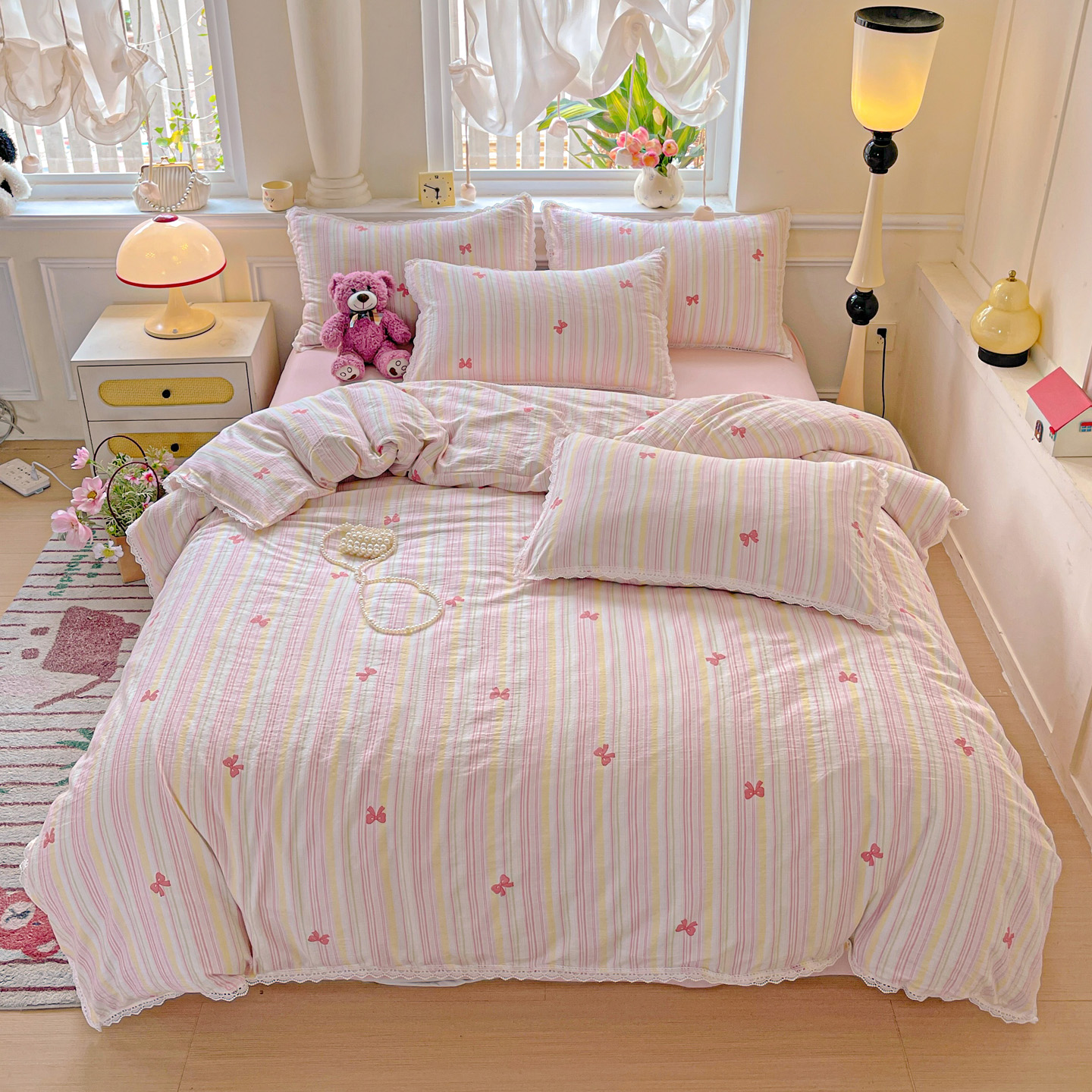 2025新款 柔软云感针织双层纱镂空白色花边家用床上用品四件套 夏季