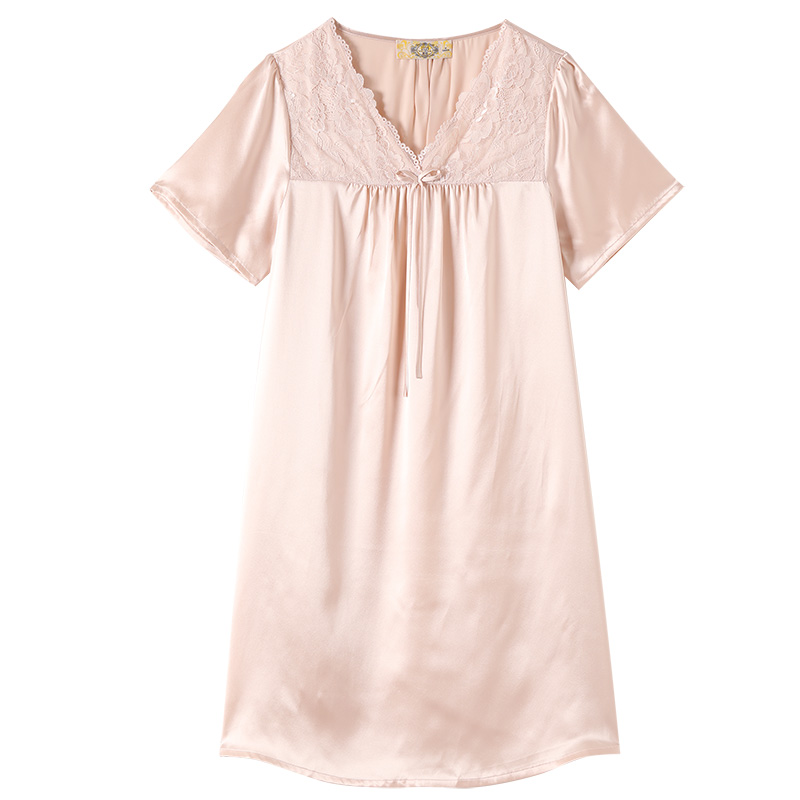 美标6A级真丝短袖 丝绸睡裙100%桑蚕丝性感蕾丝家居服 睡衣女春夏季