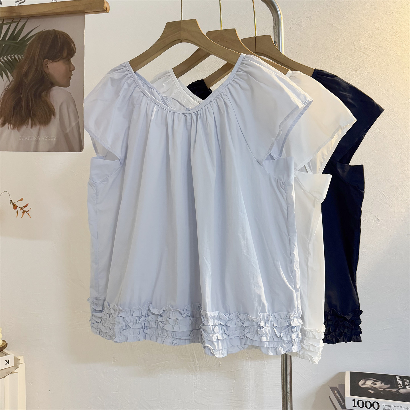 女2025夏季 衬衫 宽松减龄娃娃衫 飞飞袖 法式 韩系小衫 圆领木耳边短袖