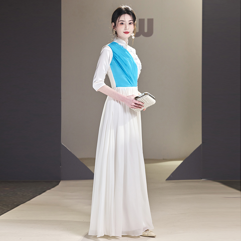 高端中国风长款 大型合唱团舞台走秀演出服夏 礼服白色雪纺宴会晚装