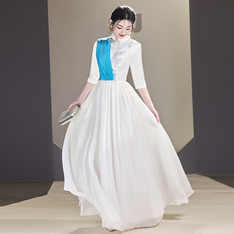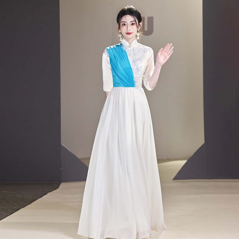 刺绣演出礼服模特团队走秀旗袍喜庆典修身 长款 白色晚装 紫缘萱中式