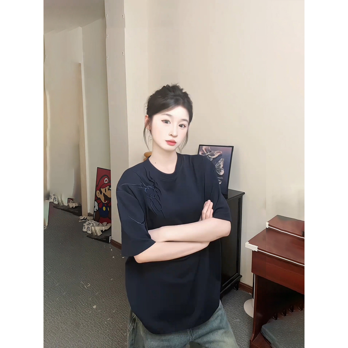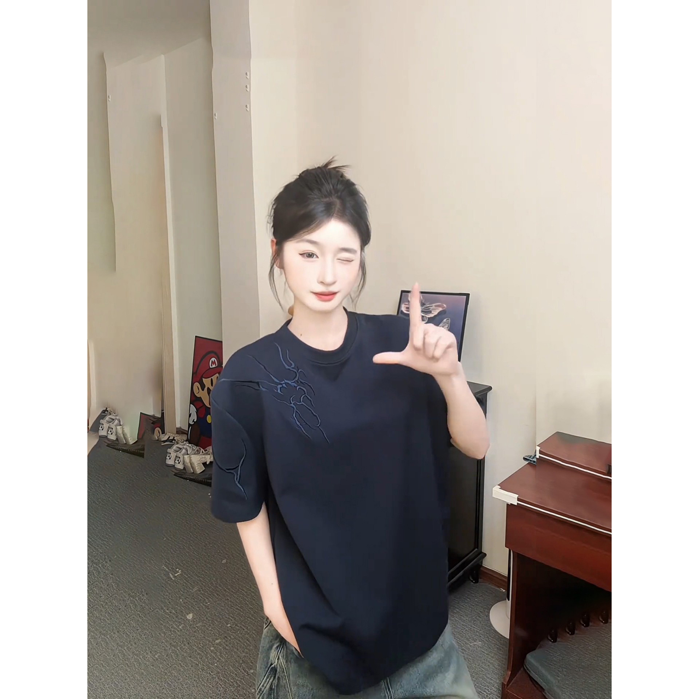 高街情侣半截袖 美式 重磅正肩短袖 藏青色暗纹闪电刺绣t恤男女夏季
