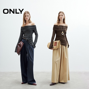 纯色T恤女 优雅一字肩褶皱不规则底摆上衣长袖 ONLY2025秋季 新款