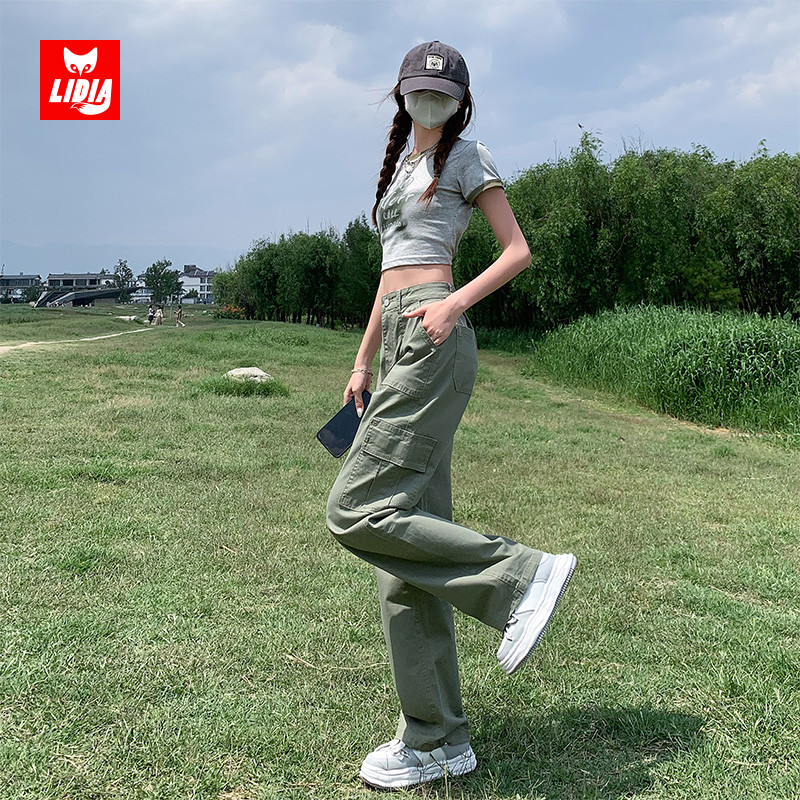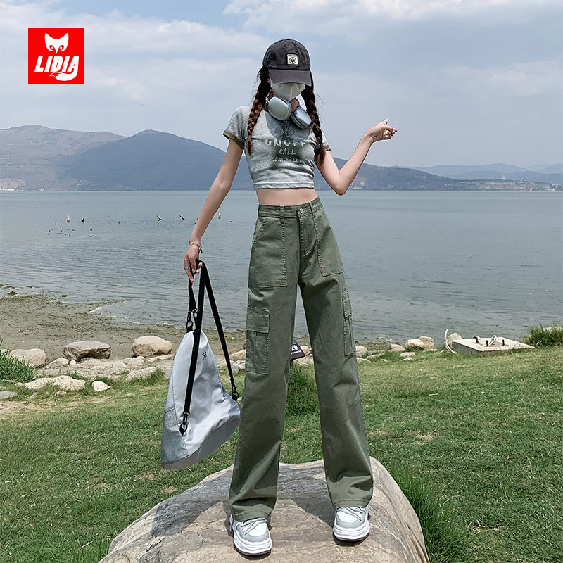 牛仔裤 阔腿裤 女秋冬2025新款 复古显瘦直筒窄版 美式 草绿色高腰工装