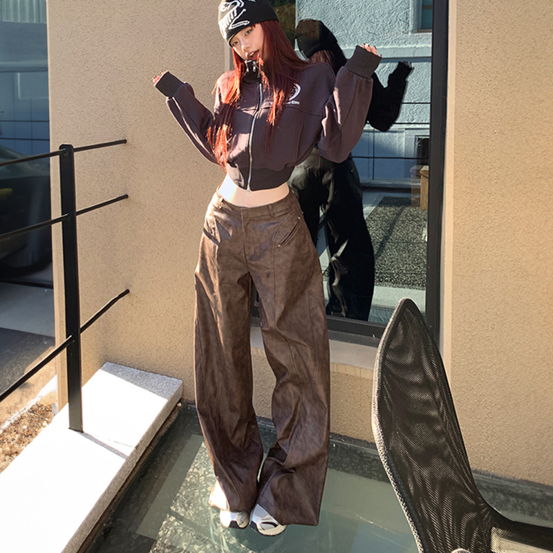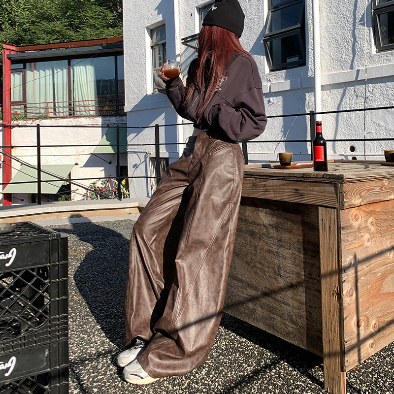 女高腰宽松显瘦直筒拖地长裤 休闲阔腿裤 子 复古棕色PU皮裤 RNBN新款