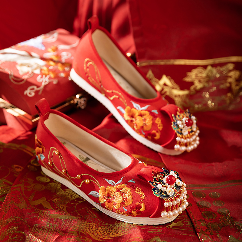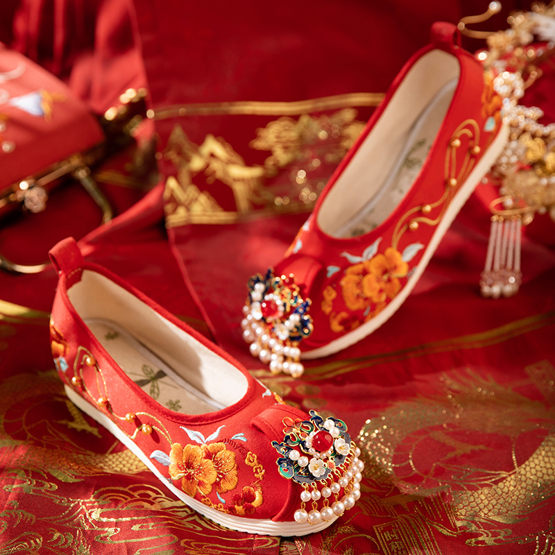 配秀禾汉服鞋 平底中式 子 圆头浅口珍珠复古红色新娘绣花鞋 古风婚鞋
