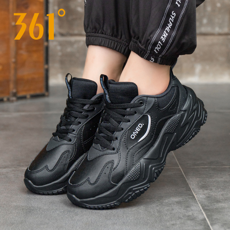 新款 秋季 厚底老爹鞋 皮面防水跑步鞋 361女鞋 361度运动鞋 黑色休闲鞋