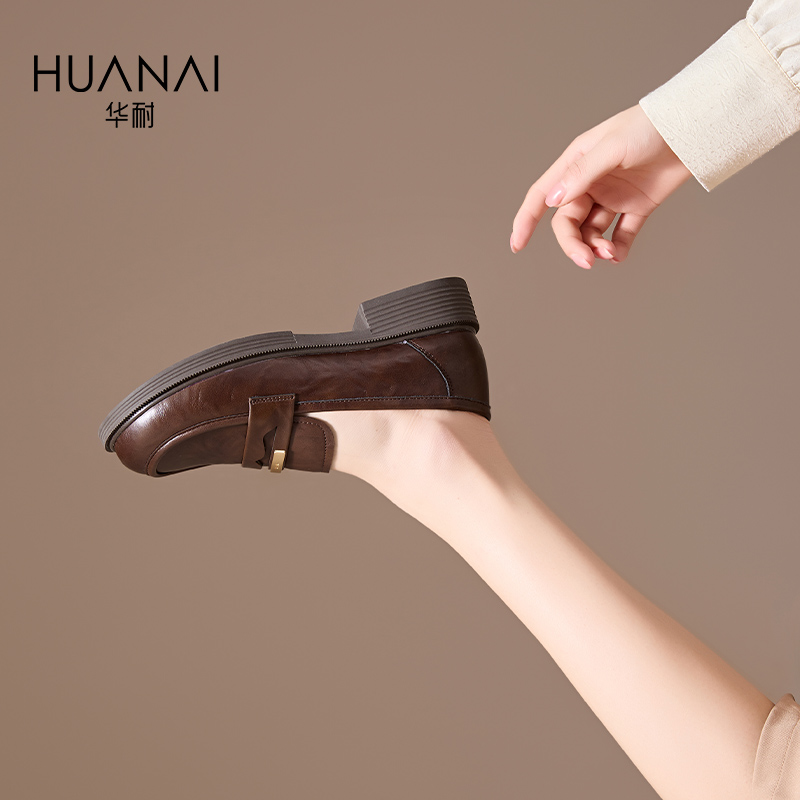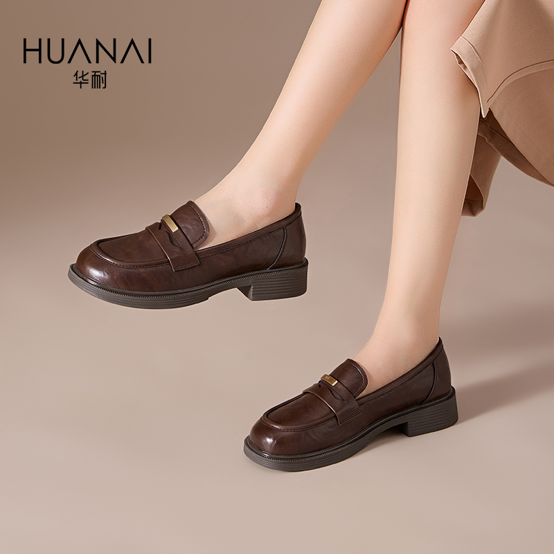 粗跟百搭深口单鞋 一脚蹬英伦风小皮鞋 子 女2025新款 华耐厚底乐福鞋