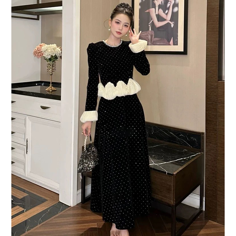 富家千金风重工气质a字裙子 连衣裙女秋季 法式 赫本风黑色丝绒长袖