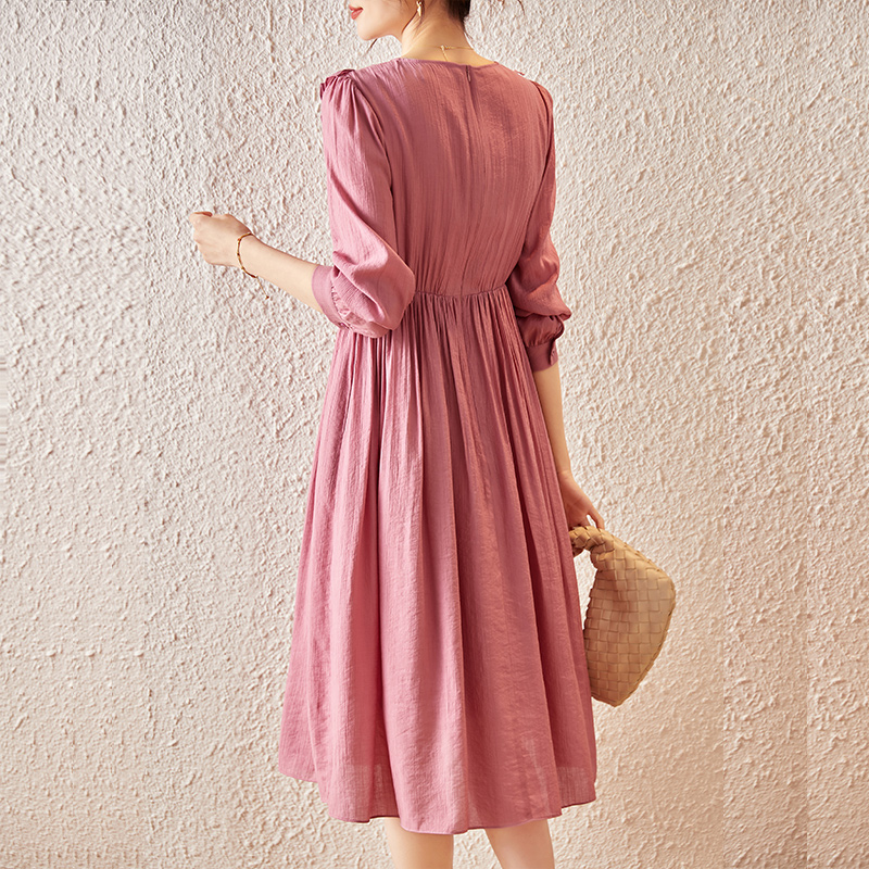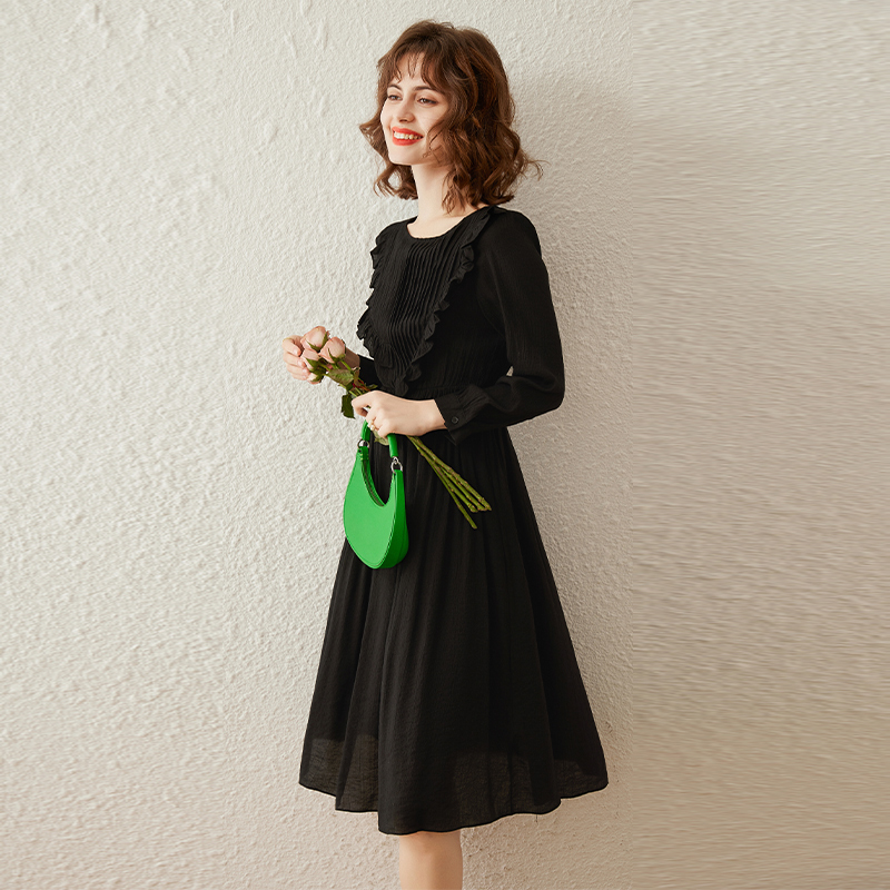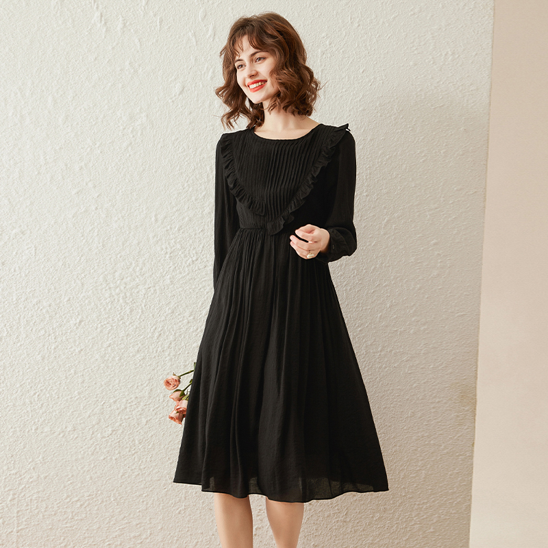 白鹿语圆领减龄收腰连衣裙秋款 小黑裙 压褶休闲通勤气质显瘦中长款